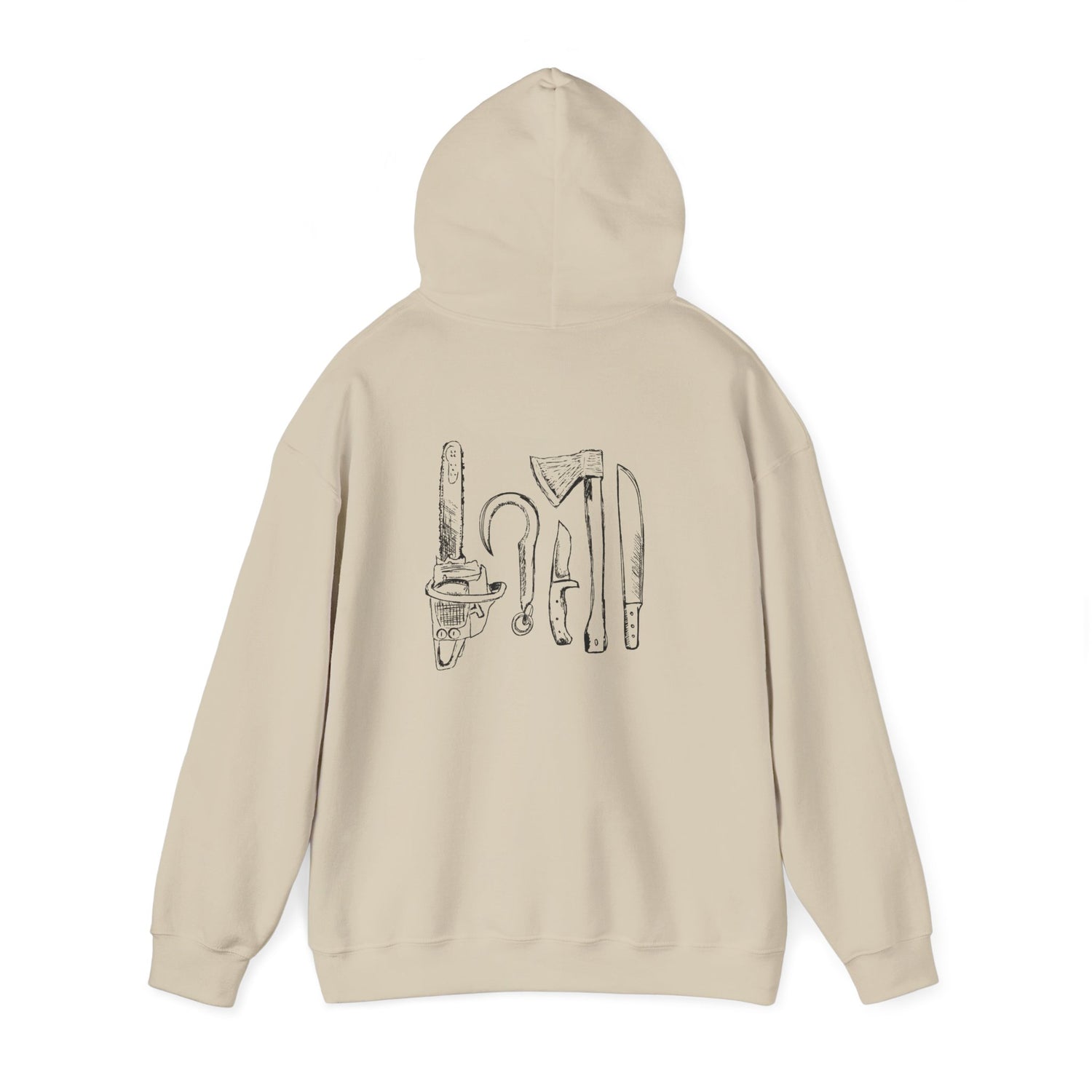 The Shudder Weapons Hoodie centers on the tools that define the genre. The back graphic assembles a lineup of iconic weapons rendered in a rough, hand‑drawn style, while a small SHUDDER logo on the chest keeps the front clean and restrained. Look closely and you might recognize a few of these tools from some of your favorite Shudder nightmares, pulled straight from moments that linger long after the credits roll.