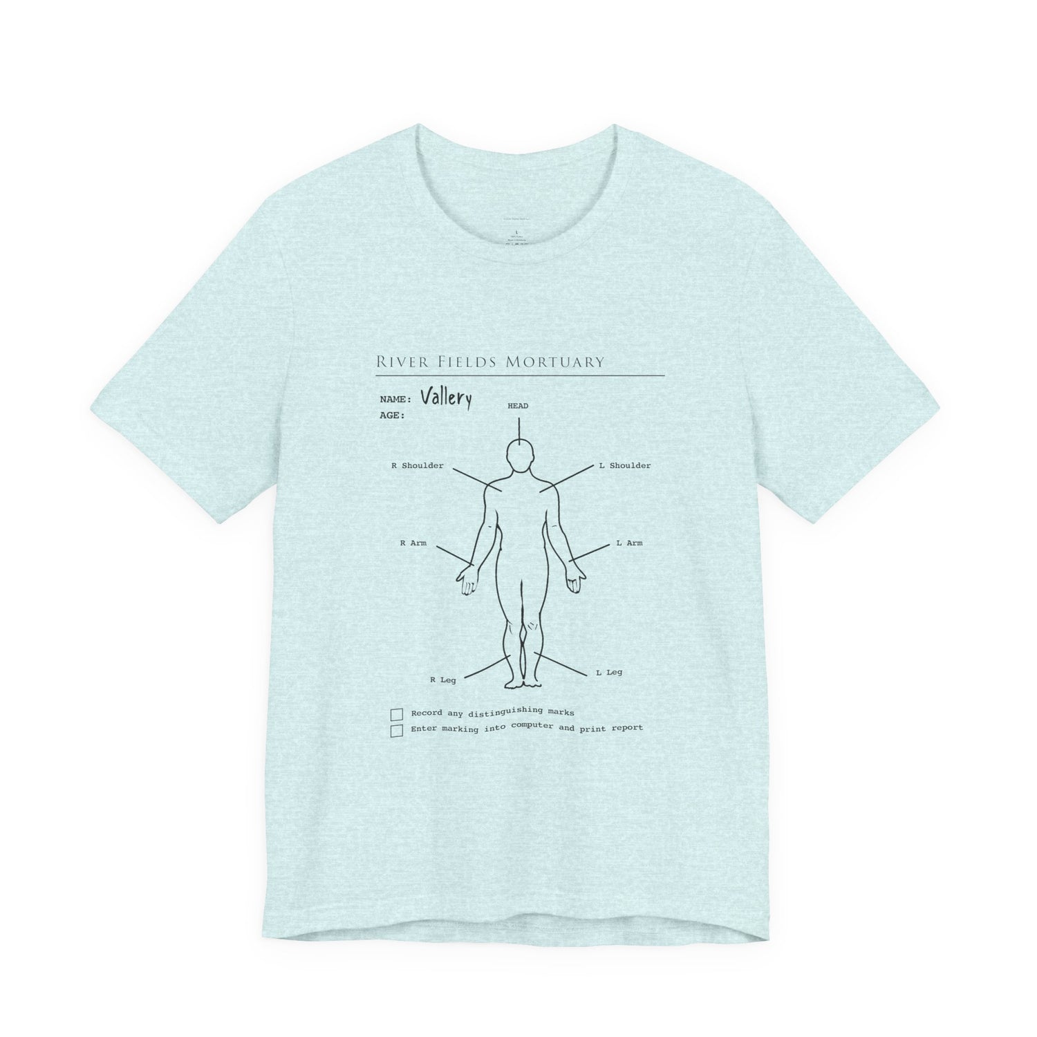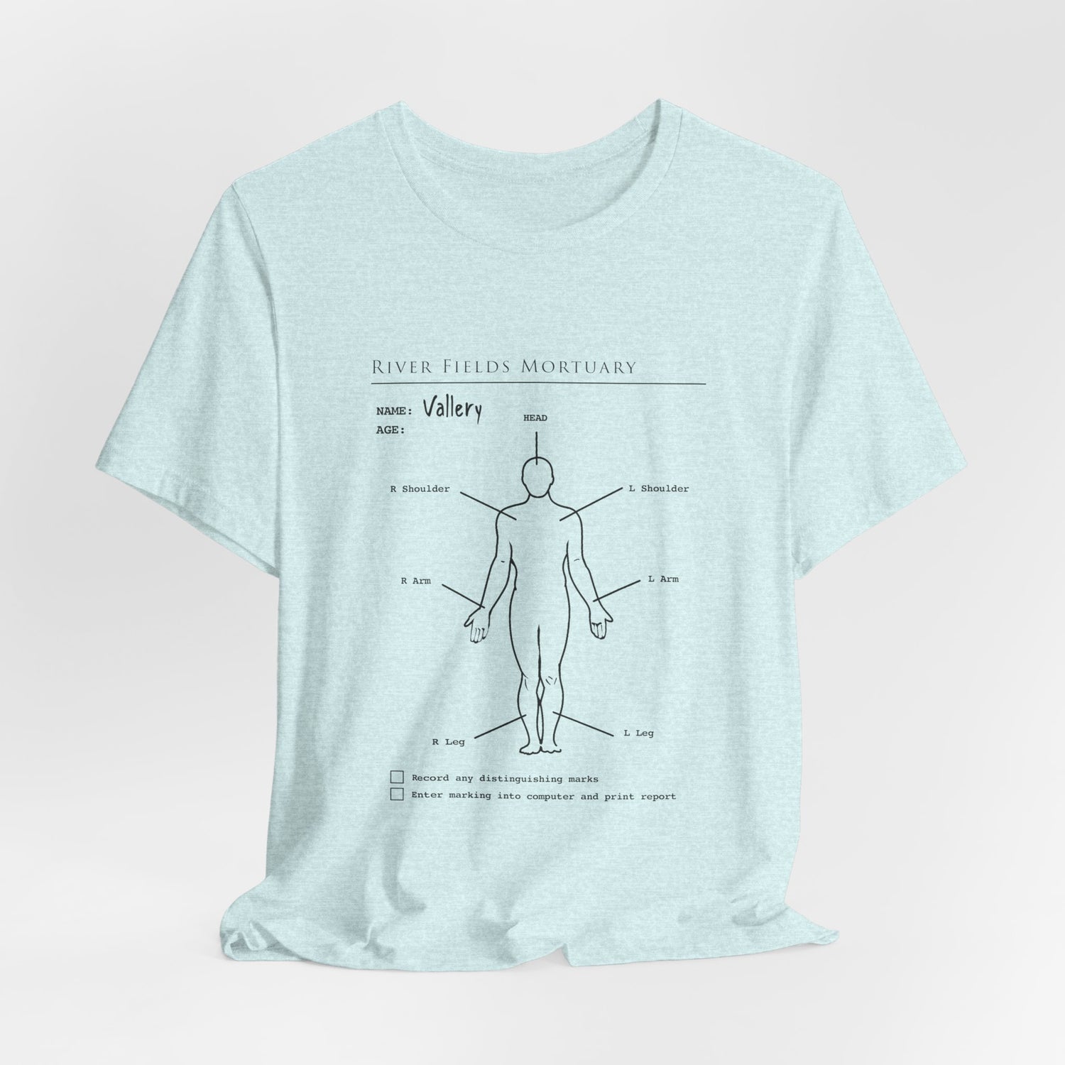 The Mortuary Assistant Clipboard Body T‑Shirt pulls directly from the cold routines of River Fields Mortuary, featuring an in‑world clipboard diagram used to document the body before something inevitably goes off script. What should be a standard intake form becomes something far more unsettling, a quiet reminder that every detail matters, and that something is always watching.