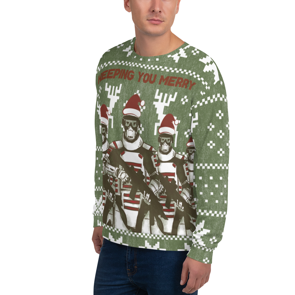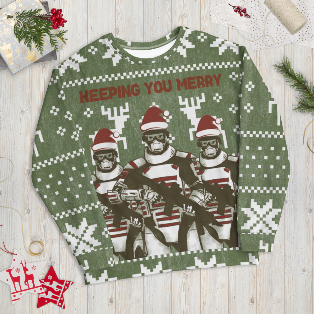 You'll be the hit of your holiday party with The Walking Dead Commonwealth Holiday Sweatshirt! This comfortable crewneck sweatshirt features everyone's favorite Commonwealth Soldiers in festive garb, ready to both keep you in line, and keep you merry! Size up for a comfier fit for when you deck the halls.